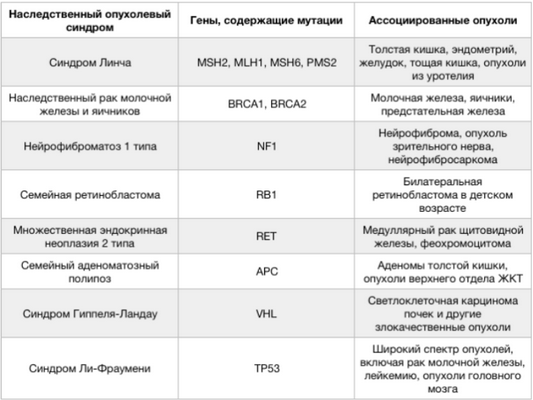 Наследственный опухолевый синдром — это состояние, связанное с формированием опухоли в результате наследования мутаций в генах, ассоциированных с онкогенезом. Мутировавшие гены чаще играют контролирующую роль и ответственны за течение клеточного цикла или репарацию ДНК. При этом, в отличие от спорадических опухолей, при наследственных опухолевых синдромах мутации обнаруживаются в генах клеток всего организма с момента формирования зиготы. Опухоль при наследственном синдроме развивается в более раннем возрасте (на 10-15 лет раньше спорадических опухолей), когда наследственный дефект репарации ДНК или течения клеточного цикла будет сочетаться с накопившимися за жизнь соматическими мутациями . Необходимо учитывать, что понятие наследственных новообразований не тождественно понятию семейных опухолей. В первом случае опухоль имеет известную молекулярно-генетическую причину, семейные же опухоли могут ей не обладать, но демонстрировать высокую частоту встречаемости в одной семейной линии.