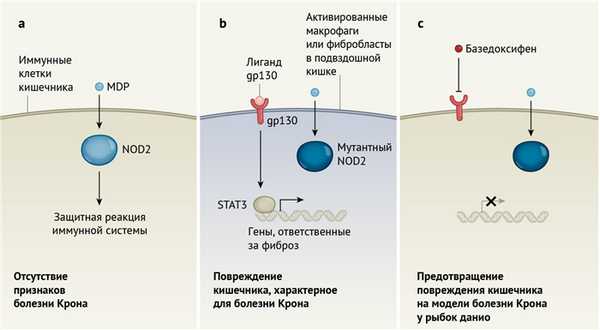 Авторы предположили, что блокада gp130 может снизить частоту аномалий, возникающих при мутации NOD2. Они проверили эту гипотезу посредством использования базедоксифена (ингибитор gp130) на обработанных MDP клетках человека с мутациями NOD2. Базедоксифен действительно привел к снижению сигнатуры экспрессии генов, связанных с фибротическими процессами и обратил вспять изменения конфигурации клеток, являющихся характерными для активированных фибробластов. Этот препарат также снижал степень повреждения тканей кишечника, что было обнаружено у мутантных по отношению к nod2 рыбок данио, подвергшихся обработке DSS.