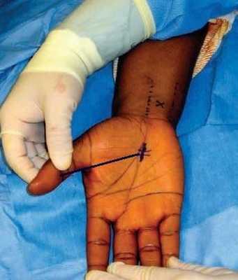 Пациент лежит на спине, запястье находится в нейтральном положении. Размечается операционное поле. Две начальные линии разрезов: одна линия проводится по продольной ладонной, а другая поперечная по оси отведенного первого пальца. В точке пересечения этих двух линий в проксимальном направлении выполняется разрез длиной 1,5 см. Дополнительным ориентиром для точки доступа к карпальной связке является место касания кончика 4го пальца при его сгибании в пястно-фаланговом и проксимальном межфаланговом суставах. В дистальном отделе предплечья проводятся две дополнительные продольные линии: первая - по наружному краю сухожилия локтевого сгибателя кисти, а вторая вдоль сухожилия длинной ладонной мышцы. Средняя точка между этими линиями обозначена буквой " x " для установки канюли эндоскопа между срединным нервом и локтевым нервно-сосудистым пучком (рис. 1).
