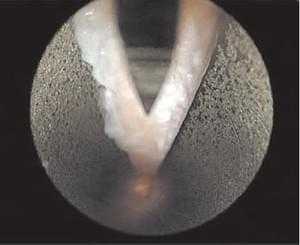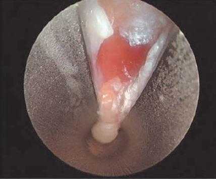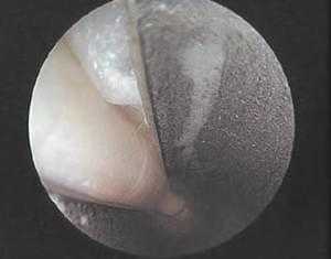 Рассечение карпальной связки считается завершенным, когда лезвие пальпируется через кожу в дистальном отделе предплечья. Затем лезвие удаляется и вводится эндоскоп для визуализации рассеченных краев запястной связки. (рис. 10). Срединный нерв и сухожилия сгибателей также должны визуализироваться, при вращении канюли. Далее все инструменты удаляются из канала, выполняется гемостаз, рана зашивается и накладывается асептическая повязка.