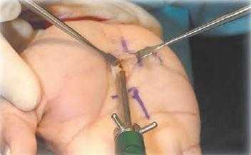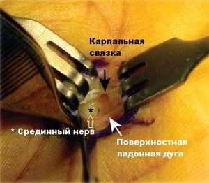 Проводится рассечение кожи в размеченной области. крючками Рагнелла разводятся края раны, отводя ладонную фасцию от лежащего под ней сосудисто-нервного пучка. Ладонная фасция рассекается продольно, чтобы обнажить среднее ладонное клетчаточное пространство. Затем визуализируется срединный нерв, поверхностная ладонная дуга и карпальная связка (рис. 2).
