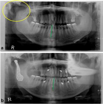 Диапазон раскрытия рта был ограничен расстоянием в 30 мм. После назначения пероральных антибиотиков с целью обеспечения инфекционного контроля была запланирована операция по реконструкции правого ВНЧС с использованием суставного протеза. Во время операции хирурги обеспечивали стабилизацию окклюзии путем межчелюстной фиксации для восстановления первоначального соотношения верхней и нижней челюстей. Установку суставного протеза проводили через два разреза: один - в околоушной области, другой - в подчелюстной по Risdon. Панорамная рентгенограмма, полученная через день после операции, подтвердила восстановление нормального окклюзионного соотношения (фото 1b). Через 3 дня пациента выписали без каких-либо осложнений послеоперационных осложнений, обеспечивая наблюдение на протяжении одного года. Протез функционировал достаточно хорошо, а восстановленная окклюзия оставалась стабильной, хотя максимальное открытие полости рта так и не удалось увеличить более чем до 30 мм.
