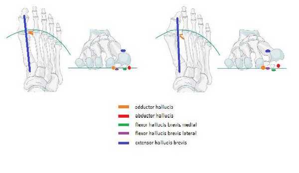 В норме во время ходьбы hallux и остальные пальцы стопы остаются параллельными продольной оси стопы, вне зависимости от приведения и внутренней ротации стопы. Это связано с силой одновременно передаваемой посредством сухожилия мышцы приводящей большой палец, разгибателя большого пальца, и сгибателей большого пальца стопы. В случае повышенной мобильности сустава разгибатель большого пальца, проходящий более латерально (кнаружи) от центральной оси начинает смещать первый палец в свою сторону. При этом сухожилия натягиваясь во время ходьбы работают как тетива лука, приводя к выгибанию всего первого луча по направлению кнутри. Головка первой плюсневой кости, смещаясь кнутри, оставляет сесамовидные кости снаружи. Сесамовидные кости расположенные в толще короткого и длинного сгибателей большого пальца в норме выполняют роль блока, усиливающего силу мышц за счёт изменения вектора нагрузки, а также несут значительную долю массы тела. При их латеральном смещении нагрузка ложится на головки первой и второй плюсневой костей, что приводит к метатарсалгии. Медиальные отделы капсулы первого плюсне-фалангового сустава натягиваются, в то время как латеральные сокращаются. Далее основной деформирующей силой становится мышца приводящая большой палец. Продолжающееся отклонение большого пальца кнаружи приводит к тому что место прикрепления мышцы приводящей большой палец смещается кнаружи и в подошвенную сторону. С этого момента вместо приведения данная мышца начинает сгибать и ротировать кнутри основную фалангу большого пальца.