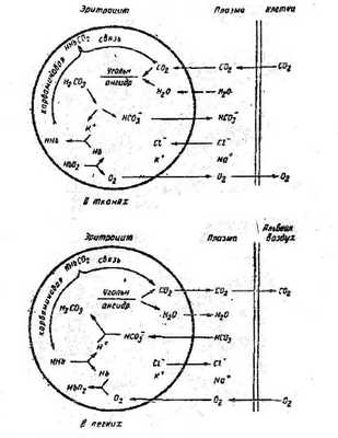 Рисунок 8. Схема процессов, происходящих в эритроцитах при поглощении или отдаче кровью кислорода и углекислого газа.