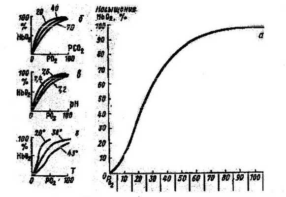 Конфигурация кривой диссоциации оксигемоглобина обусловлена главным образом химическими свойствами гемоглобина; а также влиянием температуры, pH, напряжения углекислого газа. Как правило, эти факторы смещают кривую, увеличивая иди уменьшая ее наклон, но не изменяя при этом ее S — образную форму.