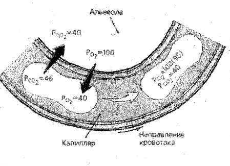 Рисунок 6. Газообмен между альвеолярным воздухом и эритроцитом. Цифрами обозначены величины парциального давления кислорода (PО2) и углекислого газа (РСО2) в артериальном и венозном конце капилляра