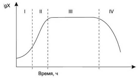 Зависимость концентрации жизнеспособных клеток бактерий в периодической культуре от длительности инкубирования описывается кривой S-образной формы, на которой различают несколько фаз роста, сменяющих друг друга в четкой последовательности: