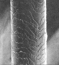 Длинные полипептидные цепи, расположенные в волокнах коркового слоя волоса параллельно друг другу, связываются между собой, образуя поперечные мостики. Если бы не эти ковалентные связи между определенными аминокислотными остатками соседних цепей, то цепи разошлись бы, и волокно распалось. Именно эти поперечные связи придают кератину его уникальные качества: прочность и эластичность .