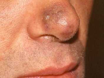 На фотографии представлена саркома Капоши на кончике носа в начальной стадии развития