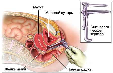 Исследование проводится до влагалищного бимануального (двуручного) исследования, так как последнее может изменить картину патологического процесса. Применяются створчатые или ложкообразные зеркала. Створчатое зеркало осторожно вводится в сомкнутом состоянии на всю длину влагалища, предварительно раздвинув левой рукой малые половые губы. Если используется ложкообразное зеркало, то дополнительно вводится подъемник, приподнимающий переднюю стенку влагалища. Обнажив шейку матки, осматривают ее, отмечая при этом цвет слизистой, характер секрета,"форму шейки матки, наличие язв, рубцов, полипов, опухолей, свищей и др. После визуального осмотра берут мазки для бактерио-скопического и цитологического исследования.
