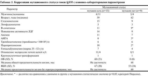 Таблица 3. Корреляция мутационного статуса генов IgVH с клинико-лабораторными параметрами Примечание. * — различие по сравнению с данными в группе с мутациями статистически значимо (р
