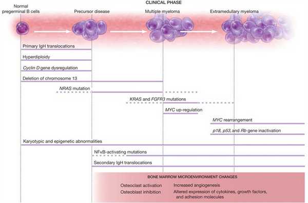 Постоянная активация ядерного фактора (nuclear factor κB — NFκB) является мутацией, приводящей к прогрессии заболевания; также причиной этому может стать инактивация или делеция генов, кодирующих белки p53 и p18, что чаще всего происходит в случаях внутрикостной и экстрамедуллярной множественной миеломы. Зависимость клеток от микроокружения костного мозга определяется стадией заболевания. Экстрамедуллярные опухолевые клетки, в свою очередь, приобрели в процессе мутаций свойства, делающие их независимыми от микроокружения опухоли.