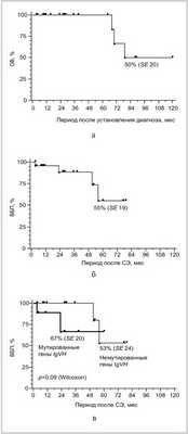 ОВ за 7 лет (см. рисунок а) для всей группы больных ЛСКМЗ составила 60% (медиана общей продолжительности жизни 80 мес), 7-летняя ВБП (см. рисунок б) — 67% (медиана продолжительности жизни без прогрессирования 60 мес). Выявлена тенденция к более частому прогрессированию заболевания у пациентов с немутированными генами IgVH (n=9) по сравнению с таковой у пациентов с мутированными генами (n=15): ВБП 53 и 67% соответственно (см. рисунок в). Наличие немутированных генов IgVH ассоциировано с увеличением вероятности прогрессии заболевания примерно в 2 раза (отношение рисков 2,0 при 95% доверительном интервале от 1,1 до 3,5). В группе пациентов с мутированными генами IgVH медиана ВБП не достигнута.