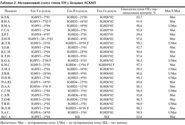Таблица 2. Мутационный статус генов VH у больных ЛСКМЗ Примечание. Mut — мутированные гены; UMut — не мутированные гены; НД — нет данных.