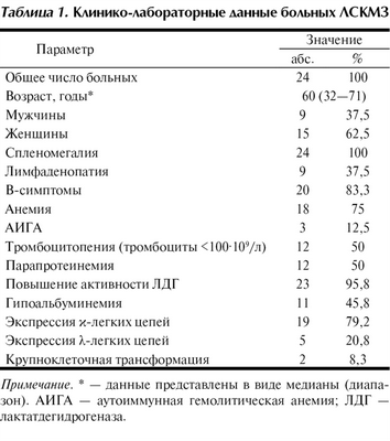 Клиническая картина. Основные клинические характеристики показаны в табл. 1. У всех больных выполнена С.Э. Лимфаденопатия в виде увеличения лимфатических узлов ворот печени и/или селезенки имелась у 9 пациентов. Поражение К.М. выявлено у 100% больных, B-симптомы — у 20 (83,3%). Анемия, АИГА, тромбоцитопения (тромбоциты менее 100·10 9 /л) зафиксированы у 18, 3 и 12 пациентов соответственно. Парапротеинемия обнаружена у 12 пациентов, в большинстве случаев с изотипом IgM. Активность ЛДГ в сыворотке крови была повышена у 23 больных. Ни в одном случае серологических маркеров вирусных гепатитов В и С не обнаружено.