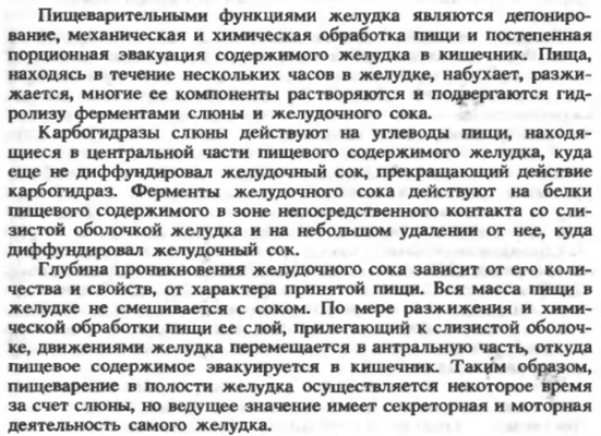 Карбогидразы слюны действуют на углеводы содержимого желудка, пищевого комка, куда еще не диффундировал желудочный сок, кислота которого прекращает действие карбогидраз. Ферменты желудочного сока действуют на белки пищевого содержимого в зоне непосредственного контакта со слизистой оболочкой желудка и на небольшом удалении от нее, куда диффундировал желудочный сок. Вся масса пищи в желудке не сразу смешивается с соком. По мере разжижения и химической обработки пиши ее слой, прилегающий к слизистой оболочке, движениями тела желудка перемещается в антральную часть, а перемешанное и гомогенизированное здесь пищевое содержимое эвакуируется в кишечник.