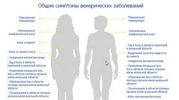Основными симптомами ЗППП являются боль, жжение, зуд в области уретры, наружных половых органов, поражение мочеполовой системы, нетипичные выделения из наружных половых органов, частое и болезненное мочеиспускание и дискомфорт при половом акте, наличие язв на поверхности наружных половых органов и заднего прохода.