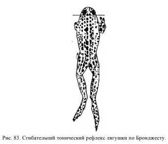 Сгибательный тонический рефлекс наблюдается и у млекопитающих, для которых характерно подогнутое положение конечностей (кролик). В то же время для большинства млекопитающих главное значение для поддержания положения тела играет не сгибательный, а разгибательный рефлекторный тонус.