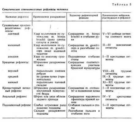 В спинном мозге замыкается огромное количество рефлекторных дуг, с помощью которых регулируются как соматические, так и вегетативные функции организма. К числу наиболее простых рефлекторных реакций относятся сухожильные рефлексы и рефлексы растяжения , вызываемые раздражением рецепторов растяжения той же мышцы, которая развивает рефлекторное сокращение. Центральные окончания афферентных волокон от рецепторов растяжения образуют синапсы непосредственно на мотонейронах без дополнительных переключений на вставочных нейронах. Таким образом, дуга этих рефлексов может иметь моносинаптический характер . Указанное обстоятельство, а также высокая скорость проведения по афферентным волокнам, идущим от мышечных рецепторов и по аксонам α-мотонейронов, обеспечивают короткое время рефлекса (что особенно демонстративно в случае сухожильных рефлексов).