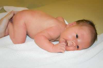 Уложить кроху на живот - младенец рефлекторно развернет голову в сторону.