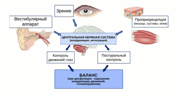 Вестибулярная, соматосенсорная и зрительная системы действуют не изолированно, а представляют собой сложную систему постурального контроля, которая работает с целью достижения равновесия.