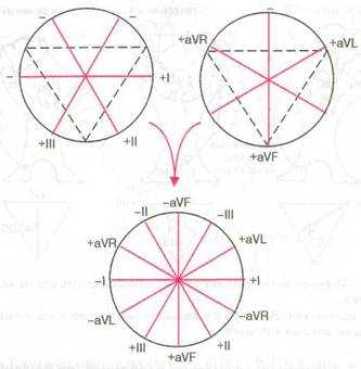 Направление осей отведений принято определять в градусах. За начало отсчета (0°) условно принимается радиус, проведенный строго горизонтально из электрического центра сердца влево по направлению к активному положительному полюсу I стандартного отведения. Положительный полюс II стандартного отведения расположен под углом +60°, отведения aVF — под углом +90°, III стандартного отведения — под углом +120°, aVL — под углом —30°, a aVR — под углом —150°. Ось отведения aVL перпендикулярна оси II стандартного отведения, ось I стандартного отведения перпендикулярна оси aVF, а ось aVR перпендикулярна оси III стандартного отведения.