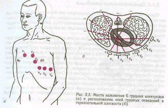 Грудные отведения регистрируют изменения ЭДС сердца преимущественно в горизонтальной плоскости. Как показано на рисунке 2.5 ось каждого грудного отведения образована линией, соединяющей электрический центр сердца с местом расположения активного электрода.