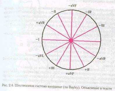 Стандартные и усиленные однополюсные отведения от конечностей регистрируют изменения электродвижущей силы сердца во фронтальной плоскости, то есть в плоскости треугольника Эйнтховена. Для точного и наглядного определения различных отклонений электродвижущей силы сердца во фронтальной плоскости предложена шестиосевая система координат (Бэйли, 1943). Оси трёх стандартных и трёх усиленных отведений от конечностей, проведённые через электрический метр сердца, образуют шестиосевую систему координат. Электрический центр сердца делит ось каждого отведения на положительную и отрицательную часть, обращённую соответственно к активному (положительному) или к отрицательному электроду (рис. 3).
