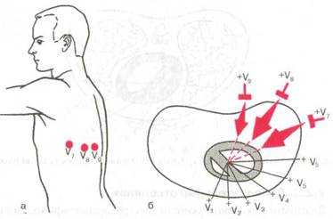 Рис.2.9. Расположение электродов (а) и осей (б) дополнительных грудных отведений V7—V9