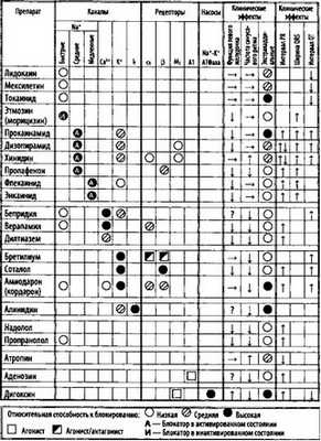 Эту классификацию критиковали многократно, и основной предмет критики заключается в том, что сюда не входят многие препараты, имеющие антиаритмическое действие. Например, дигиталис и вообще сердечные гликозиды - АТФ и другие препараты, которые как бы стоят между этими классами или имеют совершенно другие свойства. И в связи с этим, я напомню, была предложена другая классификация, так называемый «Сицилианский гамбит», который представляет собой просто описание свойств разных антиаритмических препаратов. Вот как в клеточках шахматной доски отмечены свойства, способность влиять на ионные каналы, натриевые - быстрые, средние, медленные, на кальциевые, на калиевые, на различные рецепторы - адренергические альфа-, адренергические бета-рецепторы, холинергические рецепторы и другие.