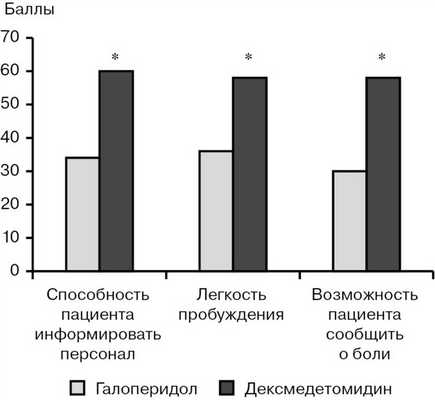 Результаты исследования представлены на рисунке. Установлено, что больные, получавшие дексмедетомидин, лучше взаимодействовали с персоналом ОРИТ. Они были способны сообщать о возникновении болевых ощущений и информировали сотрудников об изменениях в своем состоянии. Медицинским сестрам легче было обслуживать больных и выполнять процедуры во 2-й группе. Это, на наш взгляд, является существенным преимуществом. Кроме того, не стоит забывать, что диагностика возможных осложнений у хирургических больных в известной мере строится на вербальном контакте и данных анамнеза. Легкость пробуждения больных и возможность обсуждения с ними самочувствия являются существенным преимуществом дексмедетомидина.