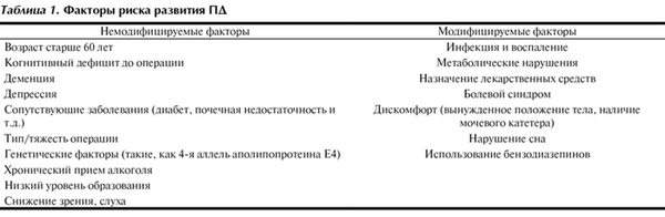 Кроме ПОКД, в раннем послеоперационном периоде в отделениях реанимации приходится наблюдать послеоперационный делирий (ПД), являющийся одной из причин возникновения когнитивных расстройств. ПД развивается в течение 24 ч после операции или с интервалом несколько дней после промежутка ясного сознания. Длительность П.Д. варьирует в широких пределах — от нескольких часов до нескольких дней. Иногда его симптоматика может сохраняться в течение длительного времени — до 1 мес [9]. Для П.Д. характерны колебание глубины нарушения сознания в течение суток и галлюцинаторно-бредовая симптоматика. В первой половине дня часто регистрируют оглушение с явлениями психомоторной заторможенности, неполной ориентировкой в месте и времени, а к вечеру и в первой половине ночи, по мере усугубления помрачения сознания, нарастает психомоторное возбуждение с вербальными и зрительными галлюцинациями [1].