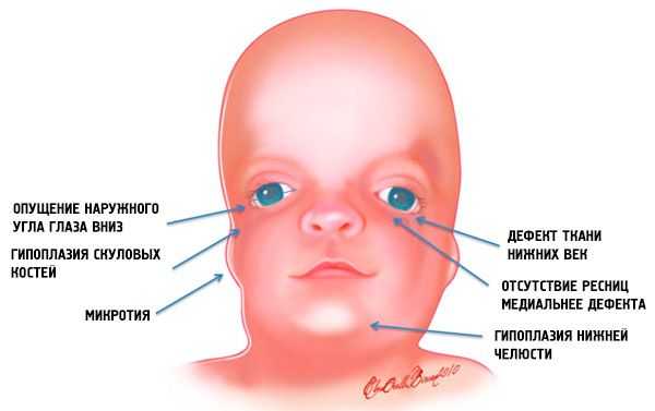 По большей части, клинические признаки мандибулофасциального дизостоза и степень их выраженности зависят от особенностей проявления генных мутаций. И первые признаки данной аномалии в большинстве случаев видны у ребенка сразу же после его появления на свет: лицо при синдроме Тричер Коллинза имеет характерный вид. Причем морфологические аномалии обычно двусторонние и симметричные.