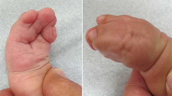 Некоторые проявления синдрома Апера заметны с самого рождения - например, синдактилия, которая может быть полной или в виде перепонок. Как правило, срастаются 2, 3 и 4 пальцы на кистях, иногда аналогичный порок возникает и на пальцах ног. Среди неонатологов симптом иногда носит название «среднего пальца» - в тяжелых случаях эти три пальца прочно срастаются между собой и имеют один общий ноготь. Другим постоянным симптомом синдрома Апера, обнаруживающимся сразу после рождения или в первые месяцы жизни, является раннее развитие синостоза костей черепа. Чаще всего происходит срастание венечного или стреловидного шва, что по мере роста головного мозга приводит к деформации черепа по типу «башенной». Из-за черепного синостоза у больных синдромом Апера наблюдается хроническое повышение внутричерепного давления, становящееся причиной задержки умственного развития, головных болей, тошноты и рвоты.