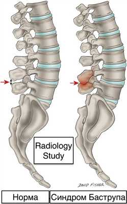 Синдром Баструпа (син целующиеся остистые отростки) - это дегенеративные изменения в остистых отростках позвонков (чаще в поясничном отделе), которые развиваются вследствие взаимного контакта приводящего к гипертрофии и склерозу с локальной болезненностью по срединной линии, облегчающейся при сгибании и усиливающейся при разгибании.