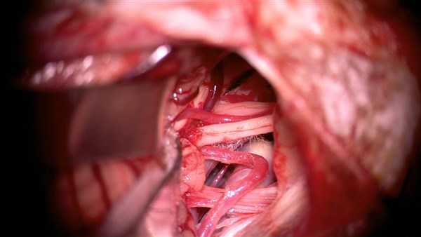 Произведено оперативное вмешательство: Ревизия правого мосто-мозжечкового угла. Васкулярная декомпрессия лицевого нерва справа с эндоскопической ассистенцией. На интраоперационных фото четко виден «конфликт» место соприкосновения и пульсирующей компрессии артериальных сосудов на корешок лицевого нерва. Артерии были мобилизованы и изолированы медицинским тефлоном. В послеоперационном периоде регресс вышеописанных жалоб.