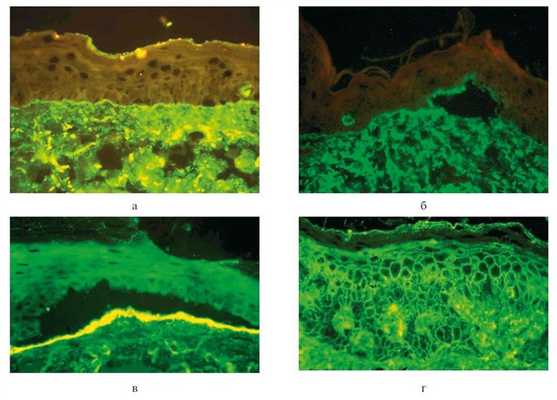 По мнению ряда авторов [35—37], в некоторых случаях патогенетическая роль при ПБЭ принадлежит циркулирующим аутоантителам класса A или одновременно IgA и IgG. Последнее подтверждает и описанный нами случай. С помощью методов меченых антител (прямой метод иммунофлюоресценции) в зоне базальной мембраны эпидермиса обнаружены связанные с тканями иммуноглобулины (IgA, IgG) и С3-компонент комплемента. Базальная мембрана эпидермиса является антигеном-мишенью для аутоантител буллезного пемфигоида и приобретенного буллезного эпидермолиза (рис. 2, a). Рисунок 2. Криостатные срезы кожи больных аутоиммунными буллезными дерматозами (для сравнительного контроля). Участки клинически непораженной кожи. Обработка меченой сывороткой против Ig G человека. Прямой метод иммунофлюоресценции (×400). a — буллезный пемфигоид: фиксация IgG в зоне базальной мембраны эпидермиса; б — в месте образовании пузыря фиксированный иммуноглобулин выявляется на покрышке в связи с фиксацией его в lamina lucida; в — фиксация IgG на дне подэпидермального пузыря (широкая щель) при ПБЭ; г — фиксация IgG в межклеточной субстанции всех слоев эпидермиса и на поверхности кожи при аутоиммунной пузырчатке. При этом фиксация аутоантител в lamina lucida и сохранение фиксированного иммуноглобулина на покрышке пузыря свидетельствуют о наличии буллезного пемфигоида (см. рис. 2, б), в то время как при ПБЭ фиксированный иммуноглобулин сохраняется на дне пузыря (см. рис. 2, в). При ПБЭ мишенью антител является lamina densa [38, 39].