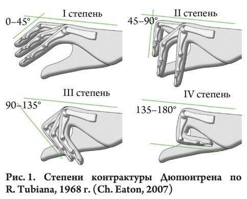 Выделяют 4 степени заболевания в зависимости от дефицита углов разгибания пораженных пальцев.