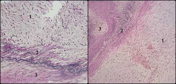Пациенту выполнено протезирование аортального клапана механическим протезом. Из интраоперационных особенностей отмечается спонтанный разрыв корня аорты на 2/3 диаметра проксимальнее области аортотомного шва ввиду выраженной дисплазии тканей и повторное подключение аппарата И.К. Ткани взяты на гистологическое исследование (рис. 5). Рис. 5. Морфологическая картина дисплазии соединительной ткани аортального клапана и аорты: рыхлая соединительная ткань с явлениями дезорганизации и миксоматозом (1), истончение и неравномерное распределение эластических волокон (2), очаговый склероз (3). Окраска пикрофуксином по Ван-Гизону с докраской на эластические волокна — ×100 (а), × 50 (б).