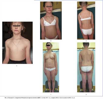Рис. 2. Больная Л. с синдромом Нетертона во время лечения в ДКВО: в октябре 2001 г. (а), в апреле 2012 г. (б, в) и в августе 2014 г. (г, д)