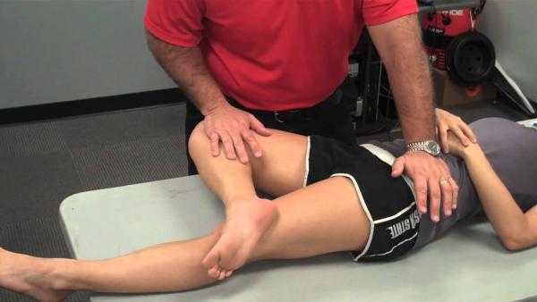 Пациент находится в положении лежа на спине. Ногу сгибают в бедре и отводят так, чтобы она опиралась латеральной стороной лодыжки на контрлатеральное бедро чуть выше или близко к колену. Теперь следует стабилизировать рукой противоположную сторону таза у передней верхней подвздошной ости. Другой рукой физиотерапевт аккуратно нажимает на ипсилатеральное колено, одновременно выполняя внешнее вращение и отведение, пока не достигнет конечной точки движения. В конце двигательного диапазона можно использовать несколько небольших амплитудных колебаний, чтобы спровоцировать боль (при наличии проблематики). Положительным считается тест либо при появлении боли, либо при ограниченном диапазоне движения.