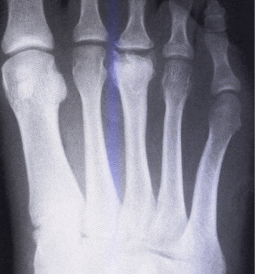 Рентгенограмма на которой отмечается формирование крупного остеофита (стрелка) в области третьего плюснефалангового сустава.