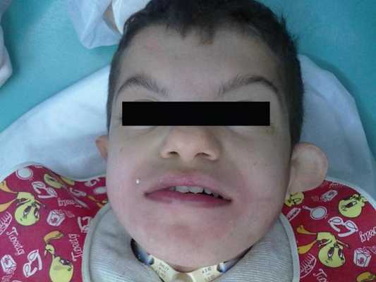 Фото 1: Лицевые характеристики пациента: асимметрия лица и двусторонний порок развития ушной раковины.