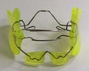 Используют этот тип при любой аномалии открытого прикуса. Пелоты помещают в область нижней губы, а вестибулярную дугу - для верхнего зубного ряда, чтобы она действовала на его ретрузию в переднем отделе. С боков ставят металлические накладки, осуществляющие зубо-альвеолярное укорочение