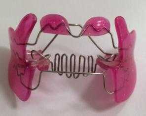 4 тип - используют при открытом прикусе, при котором при полном смыкании рта между зубами верхней и нижней челюстей остается пространство. На зубах верхней челюсти располагается вестибулярная дуга, а на нижней губе - пелоты, что оказывает тормозящее влияние на рост нижней челюсти. Сбоку конструкции прилегают металлические накладки, усиливающие лечебный эффект и восстанавливающие правильное дыхание и речь.