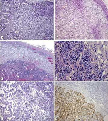 В светлоклеточном компоненте опухоли надпочечника отмечалась положительная реакция со следующими маркерами: хромогранином, А (см. рис. 1, е), синаптофизином, СD56, Ki-67 (менее 1%) и отрицательная реакция с RCC, CD10, СК18 и CK19.