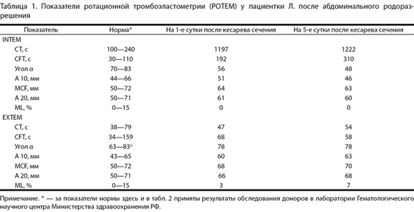 Таблица 1. Показатели ротационной тромбоэластометрии (РОТЕМ) у пациентки Л. после абдоминального родоразрешения Примечание. * — за показатели нормы здесь и в табл. 2 приняты результаты обследования доноров в лаборатории Гематологического научного центра Министерства здравоохранения РФ.