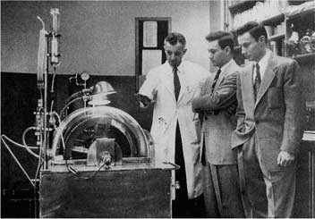 Октябрь 1954 г. Доктор Джон Меррилл (1917-1984) демонстрирует братьям-близнецам Херрик искусственную почку, работавшую в клинике Бригем с 1948 г.