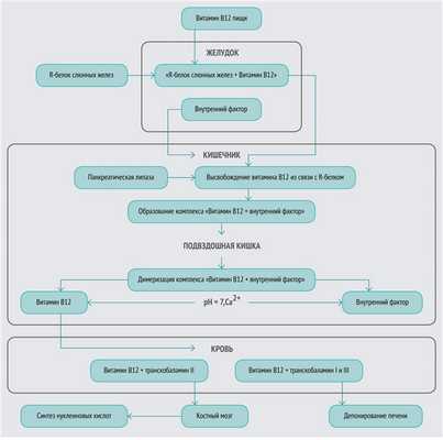 Чистый витамин В12 в биохимических реакциях выступает как кофермент при синтезе тетрагидрофолиевой кислоты, метионина, тимина и, соответственно, белков и нуклеиновых кислот. Наиболее частая причина нарушения всасывания витамина B12 — атрофия слизистой желудка, при которой отсутствует секреция соляной кислоты, пепсина и внутреннего фактора.