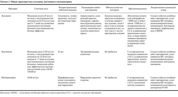 Таблица 3. Общая характеристика клозапина, кветиапина и пимавансерина Примечание. СИОЗС — селективные ингибиторы обратного захвата серотонина; ССЗ — сердечно-сосудистые заболевания.